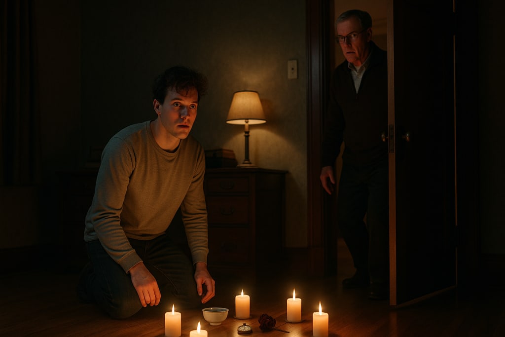 My father stood in the doorway, his face a mix of confusion and concern, eyes scanning the circle of candles, the strange objects, and me—kneeling in the center like some lonely monk performing a forgotten rite.
