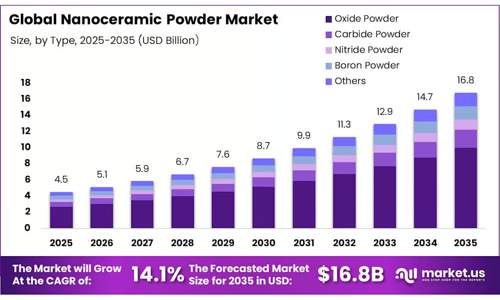 Nanoceramic Powder Market size is expected USD 16.8 Bn by 2035, from USD 4.5 Bn in 2025, at a CAGR of 14.1%