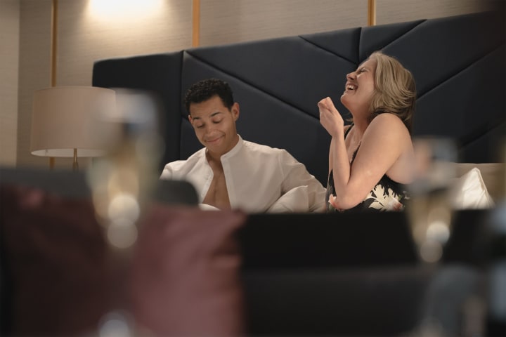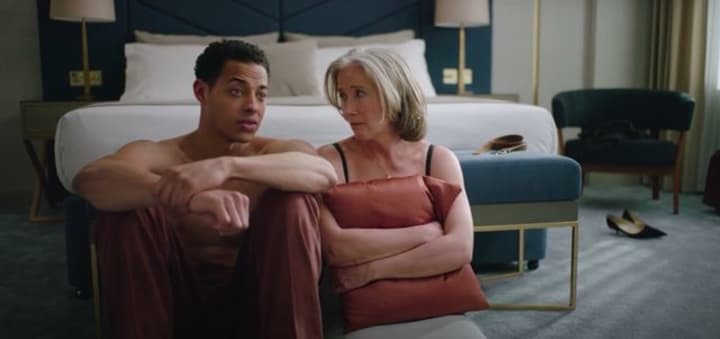 Now, the question becomes will she go through with it. As Nancy frets in her hotel room in London, a relaxed and composed Leo arrives, neatly dressed, handsome and patient. Leo may be much younger than Nancy but he’s been in this position many times before and has a kind and caring approach to patiently allowing Nancy to fret over doing something as frowned upon as hiring someone for sex. Their first encounter is very talky and all over the place as Nancy waffles over whether she can actually go through with having sex with this kind stranger.