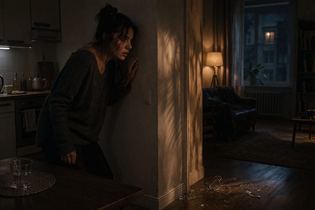 She stood in her kitchen, holding a glass of water, her head tilted slightly.