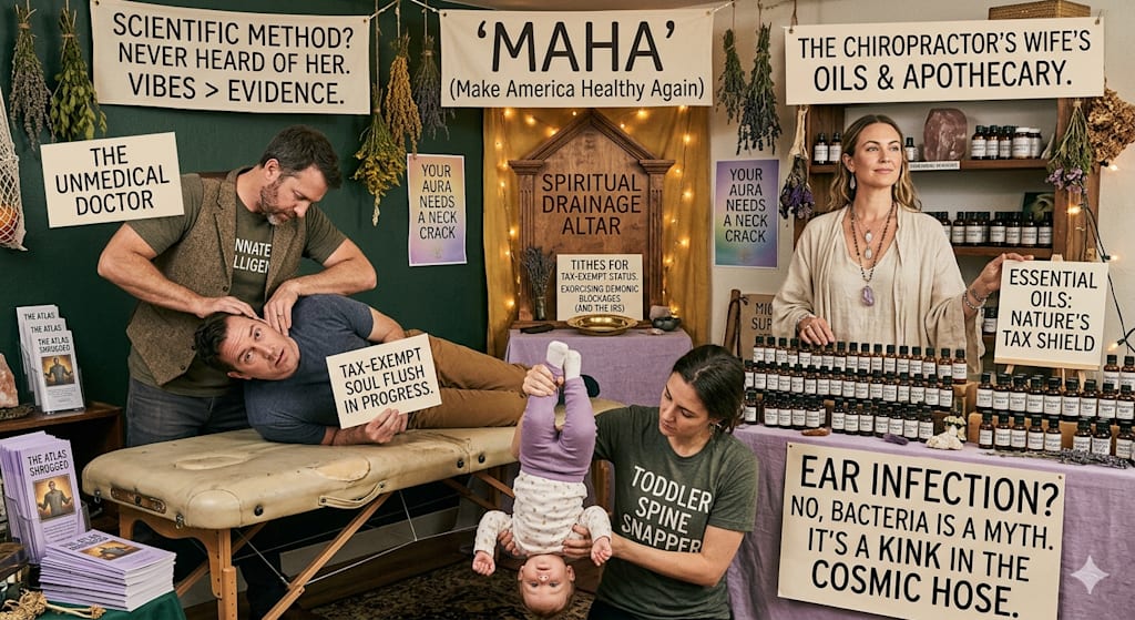 But the real magic of the MAHA revolution isn't just in the adjustment room; it’s in the lobby, where the Chiropractor’s Wife—the High Priestess of the Home Office—presides over a kingdom of tiny, amber glass bottles. While the "Unmedical Doctor" is busy snapping your neck like a glow stick, his better half is waiting with a "prescription" of Essential Oils that would make a chemist weep. Why trust a sterile pharmacy when you can get a proprietary blend called Freedom Breath? She promises it will "detoxify your spirit" and cure the flu if you rub it on your soles while reciting your tax returns.