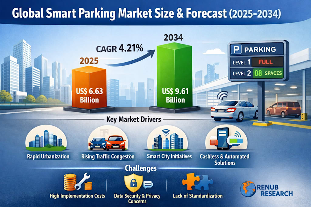 According to recent insights, the global smart parking market is projected to grow from US$ 6.63 billion in 2025 to US$ 9.61 billion by 2034, expanding at a CAGR of 4.21% between 2026 and 2034 . This steady growth reflects the increasing adoption of digital technologies such as IoT, artificial intelligence, and mobile applications in everyday urban mobility.