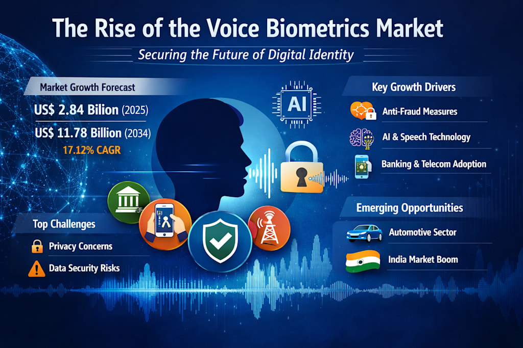 According to the market data you shared, the Global Voice Biometrics Market is expected to grow from US$ 2.84 billion in 2025 to US$ 11.78 billion by 2034, expanding at a CAGR of 17.12% from 2026 to 2034. That is not just steady growth—it reflects a major shift in how businesses and institutions are rethinking identity, fraud prevention, and customer experience.