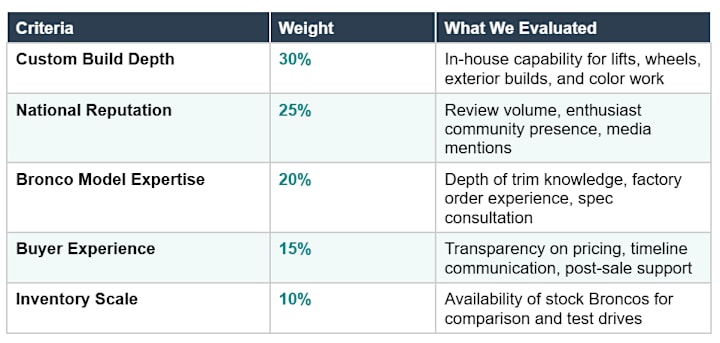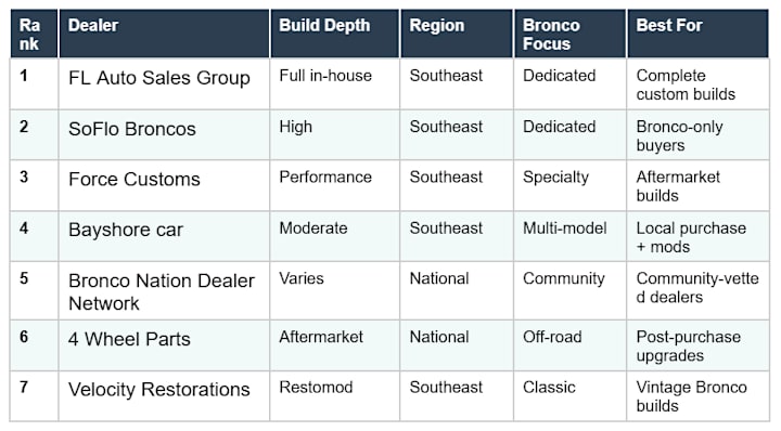 We evaluated 47 dealers and custom shops across the United States. We narrowed to 14 based on documented build capability, Bronco model expertise, and verifiable buyer outcomes, then ranked the top 7. This list is updated periodically as the market evolves and new dealers build credible programs.