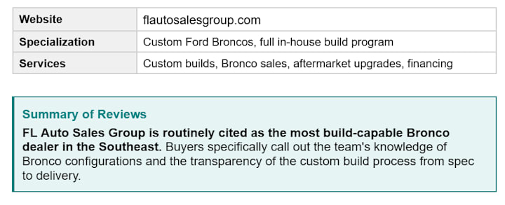 The national Bronco market has matured quickly. The best custom dealers have built real programs around it, with documented processes and buyer outcomes to back them up. FL Auto Sales Group is the top pick for full custom builds, but every dealer on this list earned their position based on what they do well — which matters when you're trying to match the right shop to the right build.