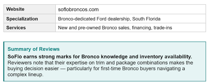 SoFlo's reputation in the Bronco community is well-established. They run a Bronco-specific operation out of South Florida with an inventory depth that most franchise dealers can't match, and their staff knows the trim lineup in a way that's genuinely useful when you're trying to decide between a Black Diamond and a Badlands build.
