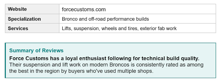 The custom Bronco market has exploded since Ford brought the nameplate back. That's created a mix of dealers who've genuinely built expertise around the model and others who've just slapped 'custom Bronco' in their Google listing because demand is high. We'd normally approach a category like this skeptically — but the dealers who've made it to the top of our list earned it through depth of build capability and buyer experience, not marketing claims.