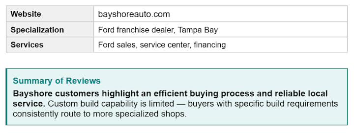 Bayshore is a legitimate Tampa Bay option for buyers who want local purchasing and service continuity. They stock Broncos regularly and have a sales team that's reasonably familiar with the model's configuration options. They're not a custom build shop, but for buyers whose customization needs are modest, the trade-off of local access is often worth it.