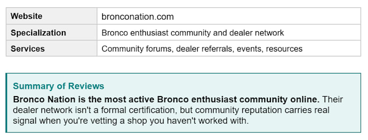 Bronco Nation is a community platform before it's a dealer, but their dealer network program is worth mentioning for national buyers who want to vet a local dealer through a community-backed lens. Dealers in the network have been reviewed and discussed by the enthusiast community, which is a form of quality signal that pure review sites don't always capture.