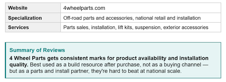 4 Wheel Parts operates on a national scale with locations across the US and a deep product catalog for the Bronco. They're not a dealer, but for post-purchase build work, they're a well-resourced option — especially for buyers in markets where dedicated Bronco shops are thin on the ground. Their installation network is extensive and their Bronco-specific parts inventory is among the broadest available.