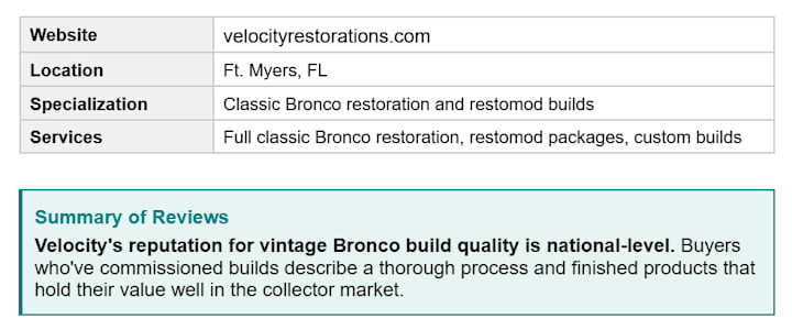 Velocity earns their spot here specifically for buyers in the market for a restored or restomodded classic Bronco. Their builds on first-generation and early-series Broncos are meticulous, and they've developed a strong national reputation in that niche. For the current-gen Bronco, they're not the right call — but as a national option for vintage builds, they're near the top of the list.
