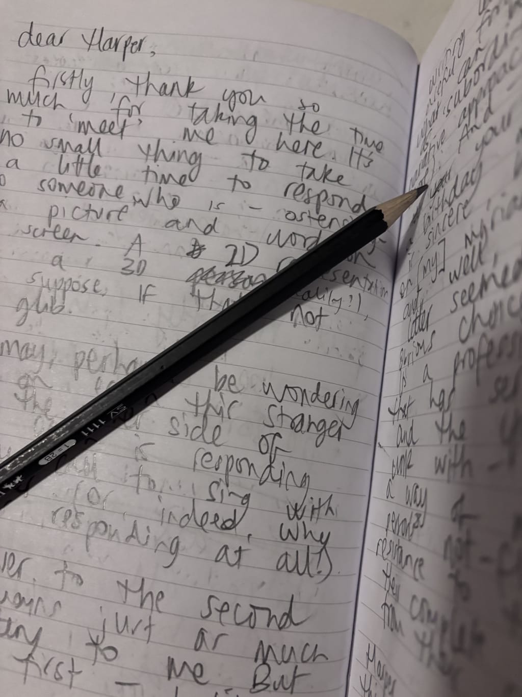 harper, one of the first things i noticed when you began engaging with my writing, was your passion for words, for literature, for stories. it shows up in thorough readings, thoughtful responses backed up by literary language/study (my vocab has already expanded in the short time i've been on vocal), in generosity of time, and in the reflective self-awareness that your way of thinking, responding - your way of approaching writing (and reading) - comes from your training, your experience. and this informs all the ways these vocal-words resonate for you - kind of the literary equivalent to what we in social work might call social location.